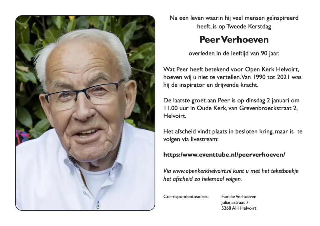 Uitvaart Peer Verhoeven2 januari 2024Vieringen Klik op onderstaande afbeelding voor de live-stream. Klik hier voor het boekje van de viering
